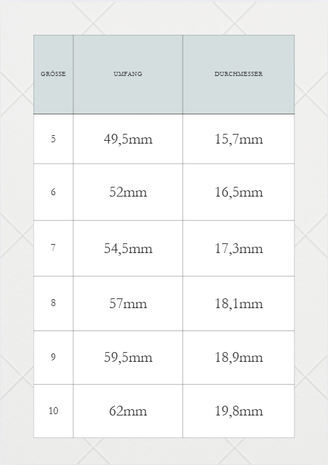 Messen Sie den Umfang Ihres Fingers mit einem Faden oder Maßband, notieren Sie die Länge und vergleichen Sie sie mit unserer Größentabelle, um die passende Ringgröße zu finden.